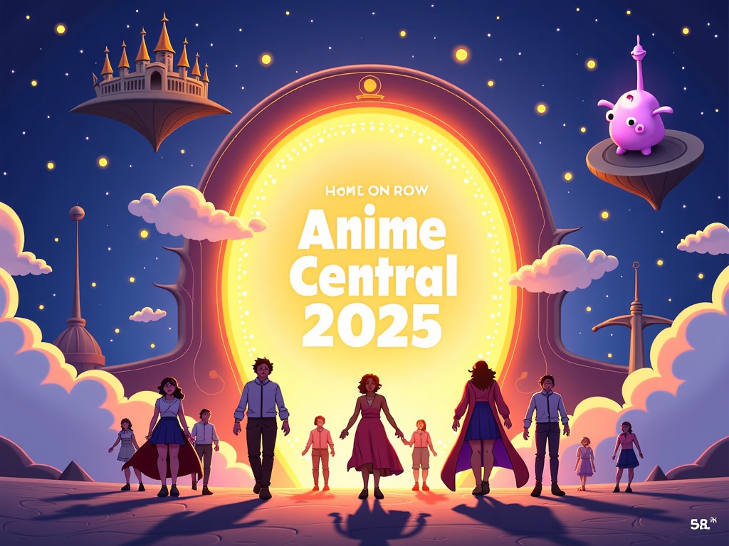 Illustration 1: 'The Grand Arrival'. Depict a stylized, glowing portal or rift in the center. From this portal, iconic elements from various Isekai genres emerge: a floating castle, a legendary sword, a cute slime companion, a status screen interface. Silhouettes of attendees could be shown approaching the portal, signifying their entry into the 'world' of Anime Central. The Anime Central 2025 logo is subtly integrated into the portal's design or a banner above it.