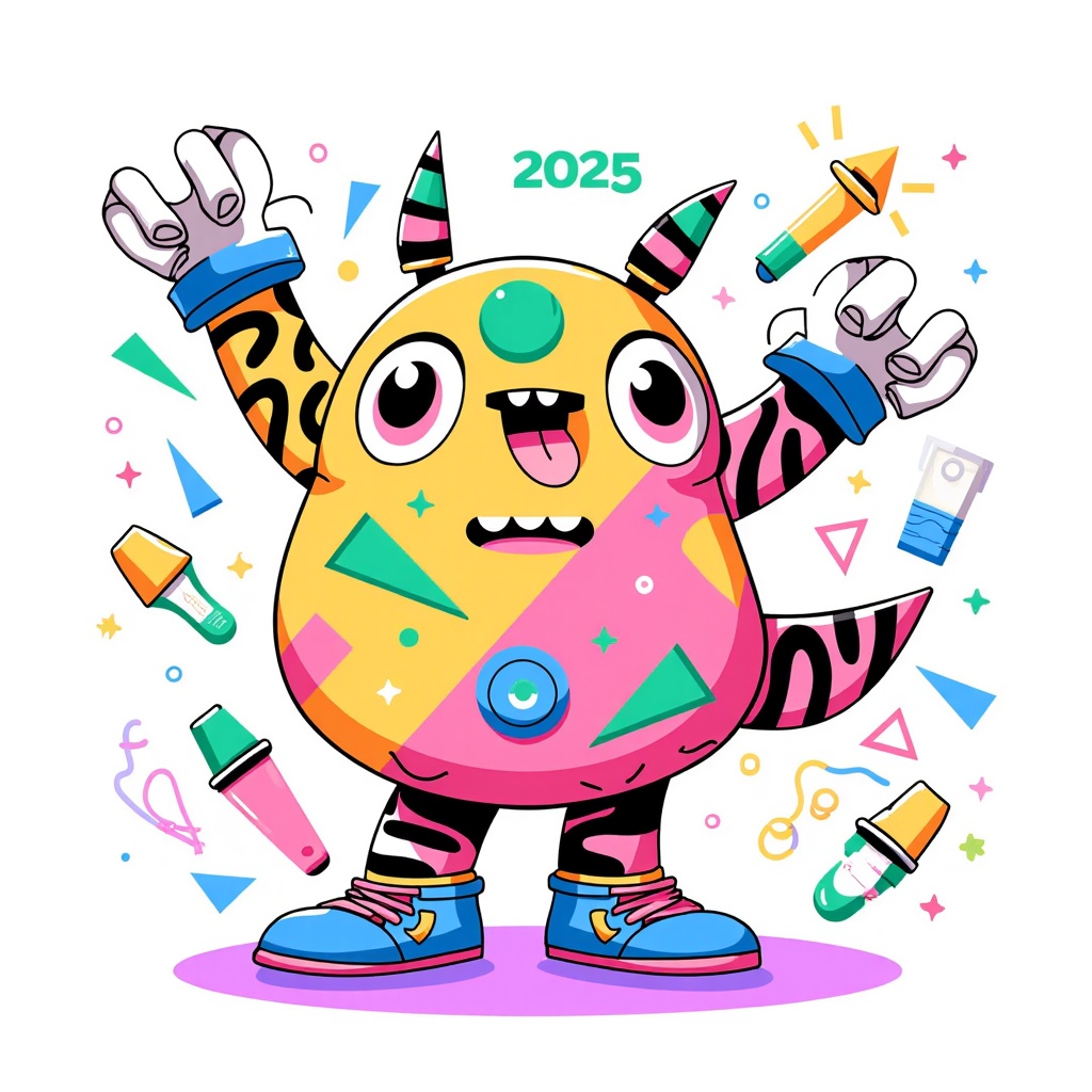 Theme: 'Mascot Mashup'. A central illustration featuring a brand-new, unique mascot for Anime Central 2025, explicitly shown as being designed by multiple hands/styles. For example, one part of the character shows one art style, another part a different style, yet harmoniously combined. The background could feature abstract representations of art tools and collaborative brainstorming elements with '2025' integrated.