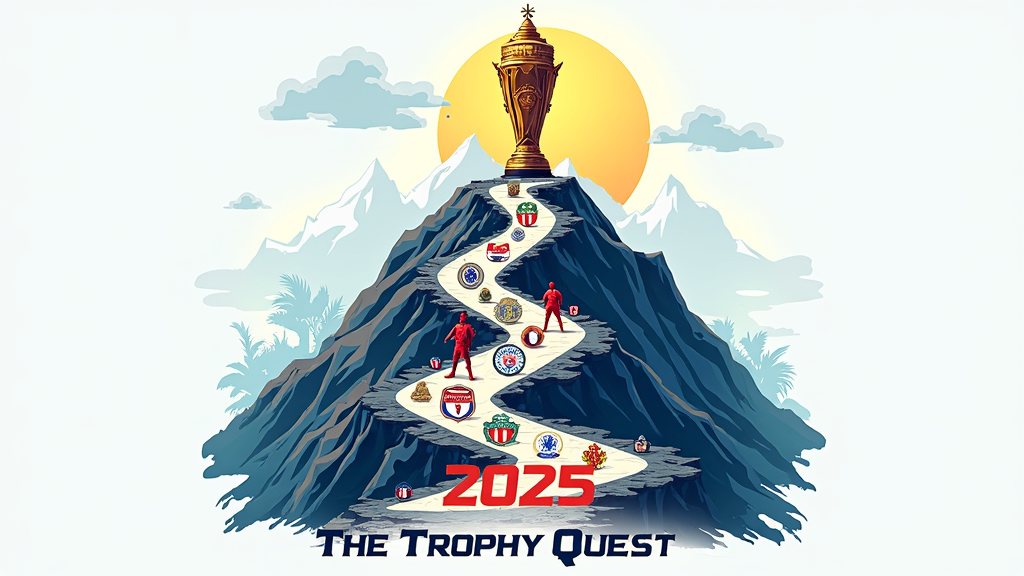 The Ascent: A design showcasing a stylized mountain path, with club motifs or abstract team representations, leading to the FIFA Club World Cup trophy at its peak, symbolizing 'The Trophy Quest'. '2025' and 'Champions' Glory' are prominently featured.