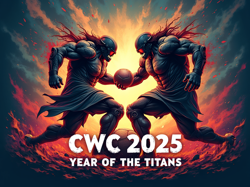 Clashing Titans Design: Feature dynamic artwork of two colossal, abstract football figures or mythical titans clashing around a football, with 'CWC 2025: Year of the Titans' integrated boldly. Use strong, contrasting colors and possibly metallic highlights.