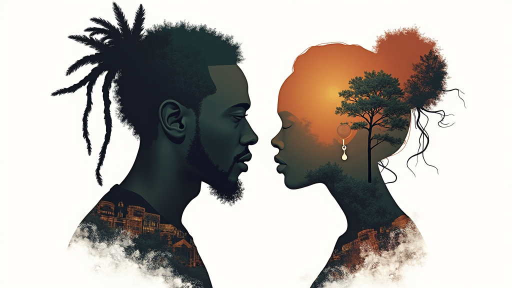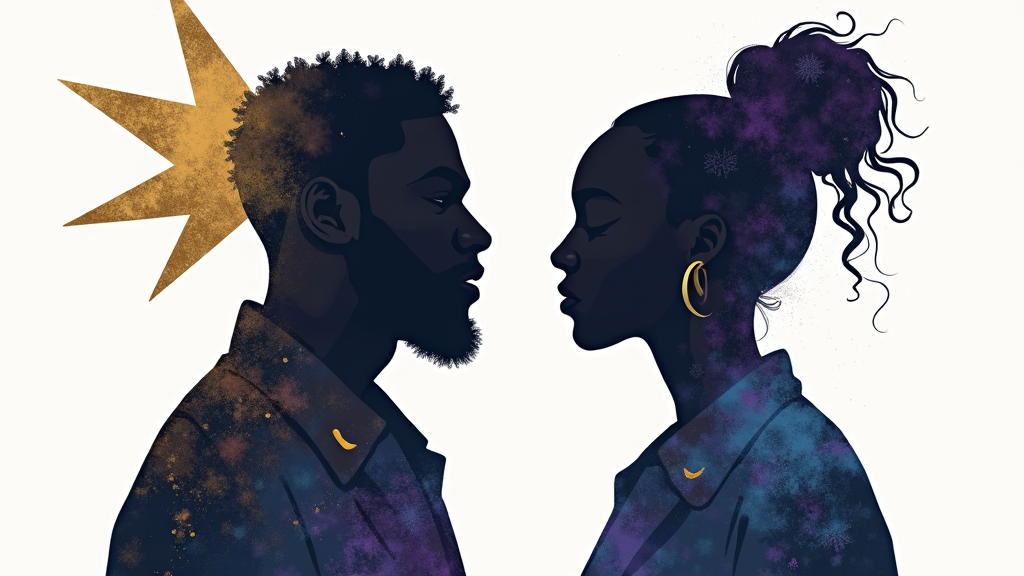 Intertwined Elements: Kendrick's side features visual representations of sharp lyrical structures (e.g., geometric patterns, cityscapes) blending into SZA's side with flowing melodic visuals (e.g., soundwaves, natural elements, nebulae). Their silhouettes facing back-to-back or profiles merging.