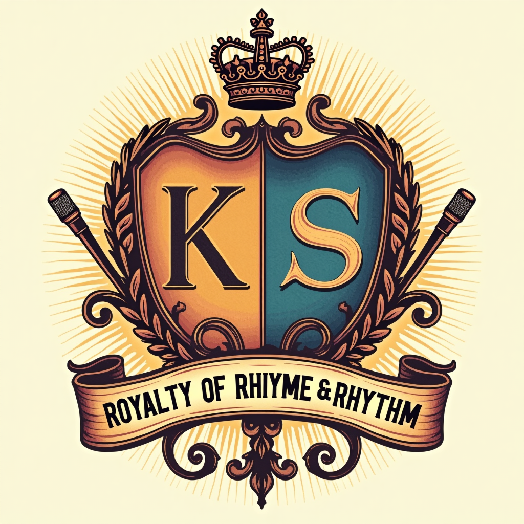 Vintage Royal Crest: A custom crest combining symbols for rhyme (e.g., a quill, a microphone) and rhythm (e.g., a musical note, a drum). Kendrick's initial 'K' and SZA's 'S' incorporated like royal monograms. 'Royalty of Rhyme & Rhythm' as motto.