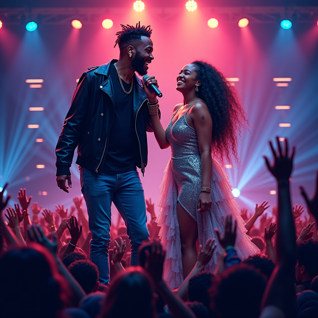 Cosmic Harmony: Kendrick and SZA depicted as cosmic figures or constellations, one representing sharp, rhythmic celestial bodies (e.g., comets, angular stars) and the other smooth, melodic ones (e.g., flowing galaxies, soft nebulae). Their energies intertwine. 'Royalty of Rhyme & Rhythm' written in stardust-like lettering.