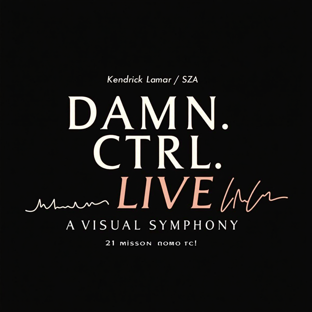 Typographic Harmony: A design focused on the interplay of typography. 'DAMN.' and 'CTRL.' are prominent, with 'Live: A Visual Symphony' acting as a connecting or underlying phrase. Font choices should contrast and complement – 'DAMN.' could be bold and impactful, 'CTRL.' more ethereal or digitally inspired. Colors are drawn from both album aesthetics.