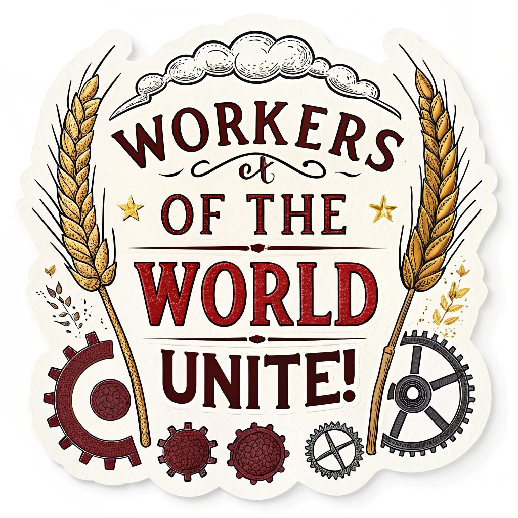 Sub Design Idea 3: Sticker focusing on typography from vintage protest signs or banners, stating a classic slogan like 'Workers of the World, Unite!' or 'Eight hours for work, eight hours for rest, eight hours for what we will', perhaps framed by simple graphic elements like wheat stalks or gears.