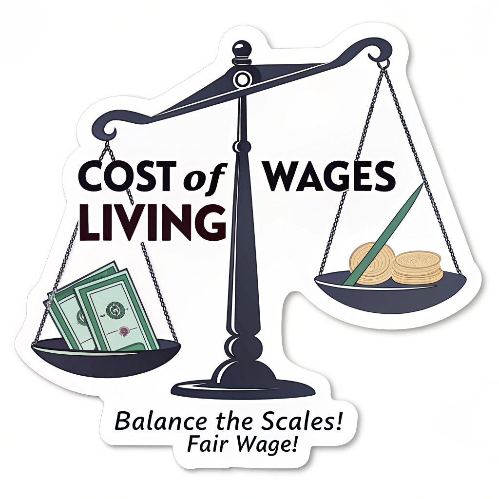 A graphic depicting a simple balance scale, heavily tilted down by 'COST OF LIVING' on one side, with 'WAGES' struggling to lift the other. Text below: 'Balance the Scales! Fair Wage!'.