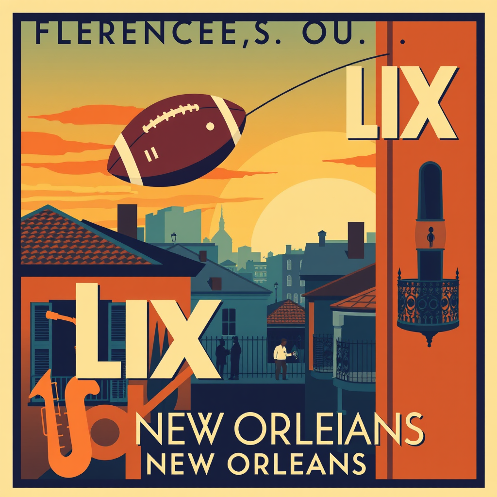 A dynamic silhouette of a football player in an action pose (e.g., catching, running, or throwing) against a stylized backdrop that incorporates elements of New Orleans architecture, such as wrought iron details or French Quarter building outlines. 'LIX' could be boldly displayed using a font inspired by NOLA's unique typography or integrated into the sports action.