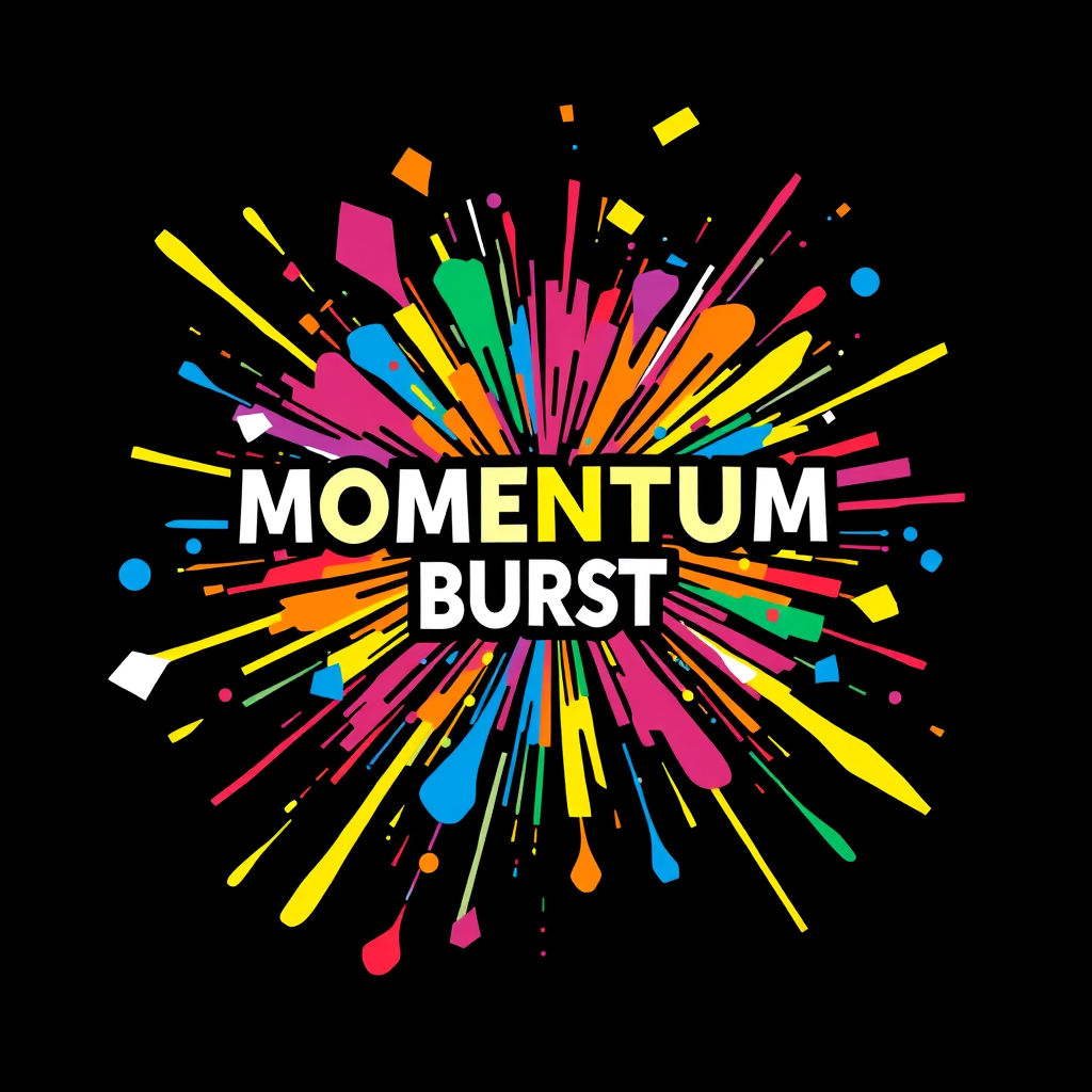 Momentum Burst: An energetic burst of Pride colors from a central point, with elements like abstract shapes, confetti, or stylized 'M's radiating outwards, signifying dynamic merriment and forward motion.